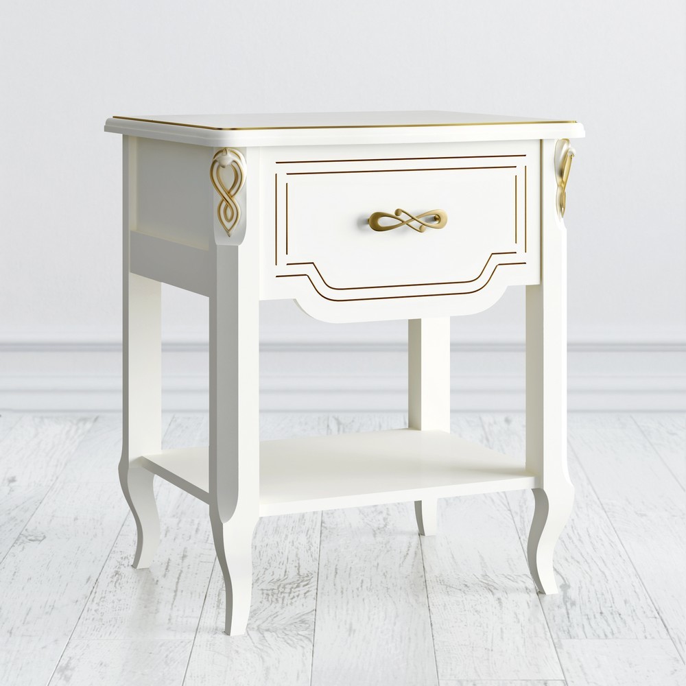Особенностью коллекции является цвет «слоновая кость» с золотой патиной. Этот оттенок придаёт мебели изысканность и благородство. Тумба оснащена шариковыми направляющими, которые обеспечивают плавное и бесшумное открывание ящиков. Изящные ножки добавляют лёгкости и воздушности дизайну.