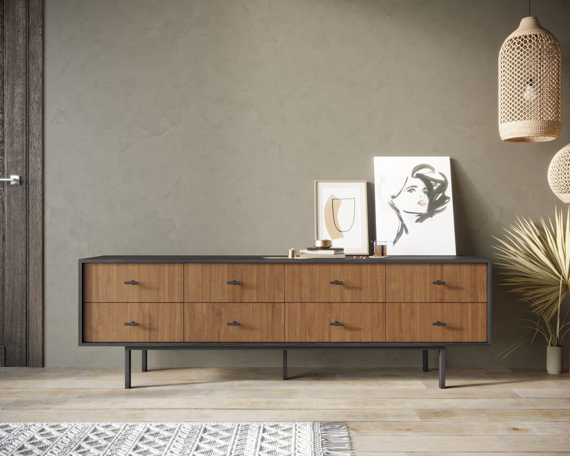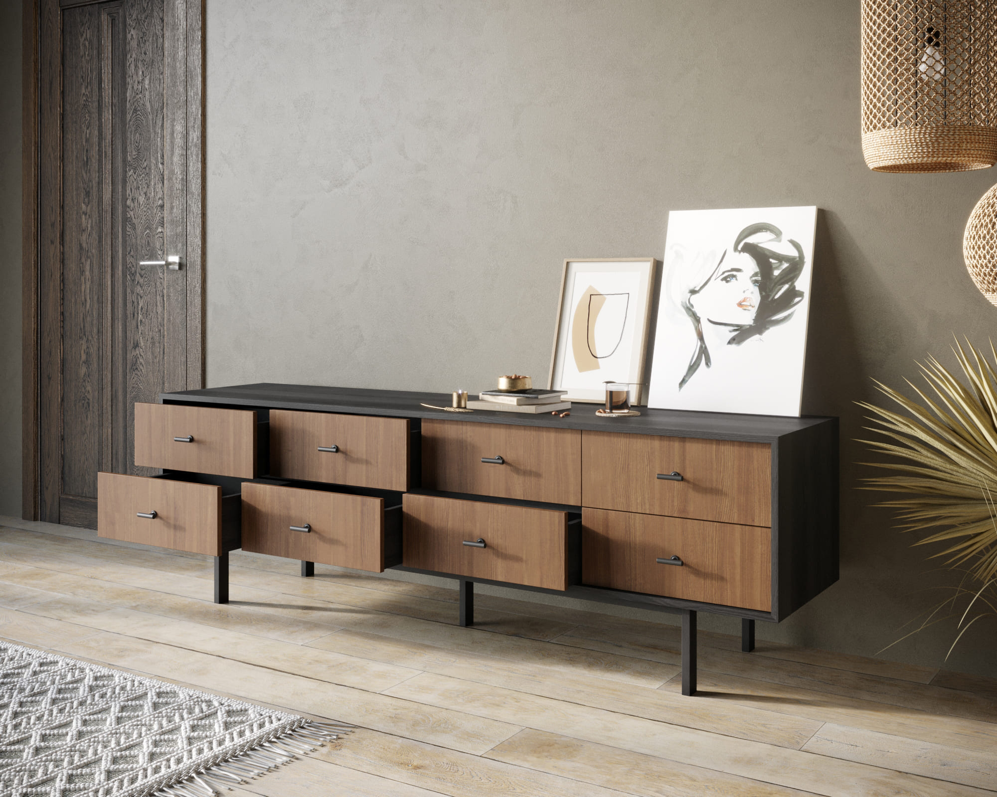 Мы предлагаем различные варианты исполнения: с фасадами или с фасадами и ящиками. Петли с доводчиком обеспечивают плавное закрывание дверей, а шариковые направляющие без доводчика позволяют легко выдвигать ящики. Комод поставляется в сборе, что упрощает его установку.
