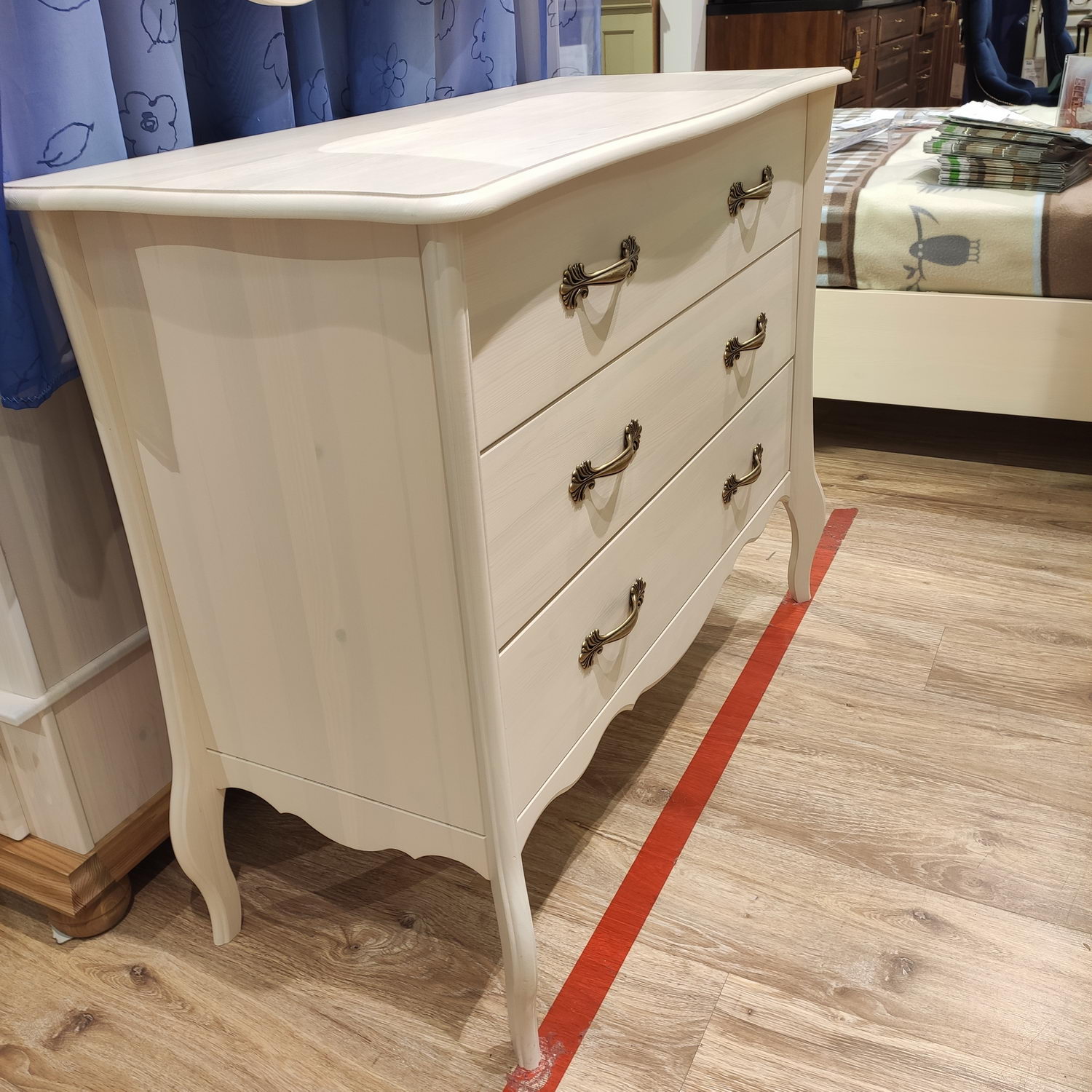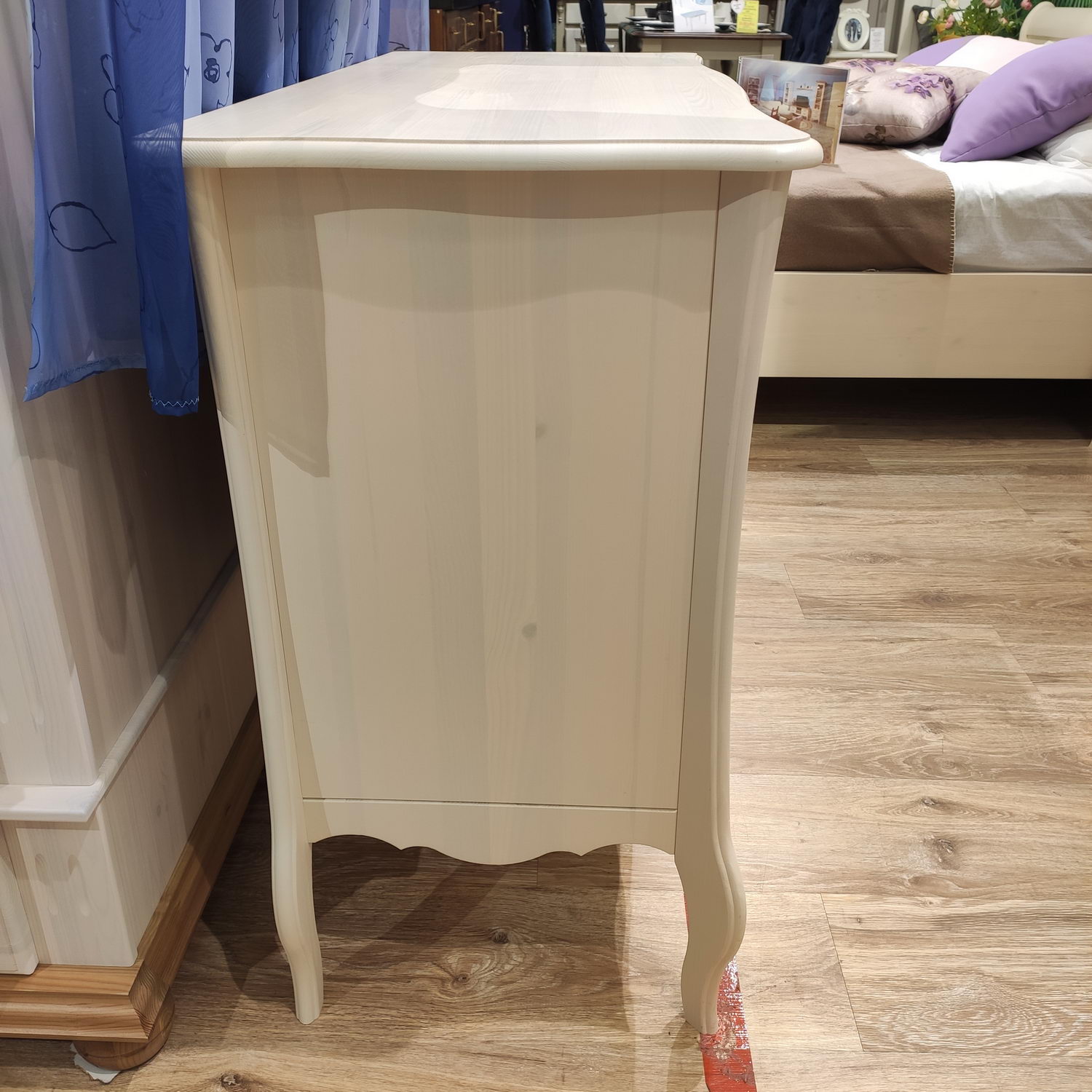 Лебо - изящная коллекция мебели во французском стиле. При изготовлении комода, кроме массива сосны, не применяется никакие другие материалы, наподобие дсп, мдф и других материалов, которые могли бы поставить под сомнение прочность и надежность конструкции. Комод Лебо с 3-мя ящиками удобная и функциональная мебель. Он легко впишется как в маленькие комнаты, так и в просторные помещения. Габаритные размеры комода 1080*450*855 (Ш*Г*В). В нем удобно хранить как постельное белье, так и одежду. На комод можно устанавливать теле и радиоаппаратуру, а также использовать как повседневный столик для косметики и других вещей. В комоде Лебо 3 ящика. Направляющие ящиков с доводчиками скрытого монтажа от крупнейшего международного предприятия BLUM (Австрия). Это обеспечивает плавный, бесшумный ход ящиков. Внутренние части выдвижных ящиков окрашены в цвет корпуса и фасадов мебели. В коллекции используются мебельные ручки фирмы Giusti (Италия). Изысканные гнутые ножки придают изящество и подчеркивают стиль Прованс. Такое изделие прекрасно впишется как в классический, так и в другой интерьер. Изделие изготовлено из массива сосны и выполнено в цвете – бежевый воск, в котором структура дерева слегка просвечивает. Комбинация цвета бежевый воск/антик подразумевает отделку столешницы в цвет «антик», остальная часть изделия в цвете «бежевый». Комод Лебо с 3 ящиками поставляется в разобранном виде. Размеры упаковки: 1уп.-1110х510х140