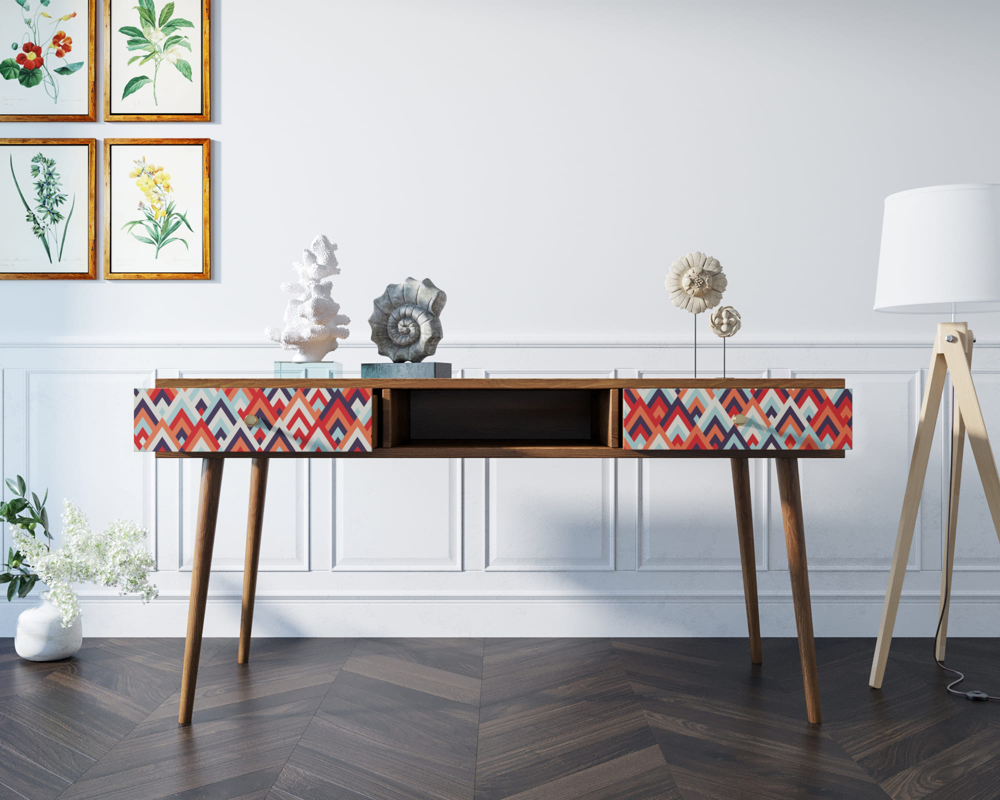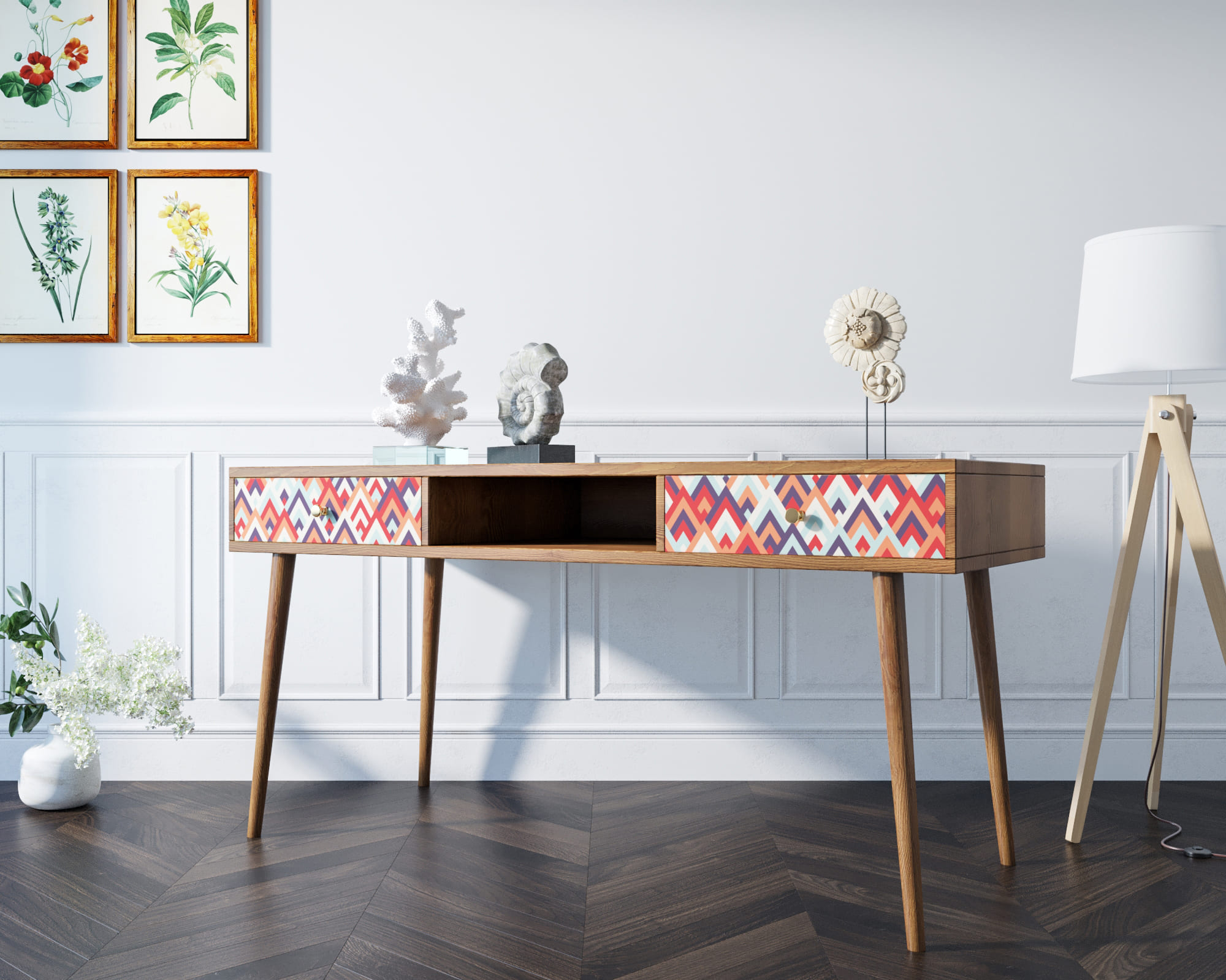 Рабочий стол "Berber" отлично впишется в детскую комнату или рабочий кабинет, но здесь стоит подобрать правильный принт. Два вместительных ящика на металлических направляющих, ноги из массива ясеня окрашенные итальянской морилкой, ниша под бумаги и мелочи, и все это в сочетании со скандинавским дизайном придадут интерьеру особый акцент.