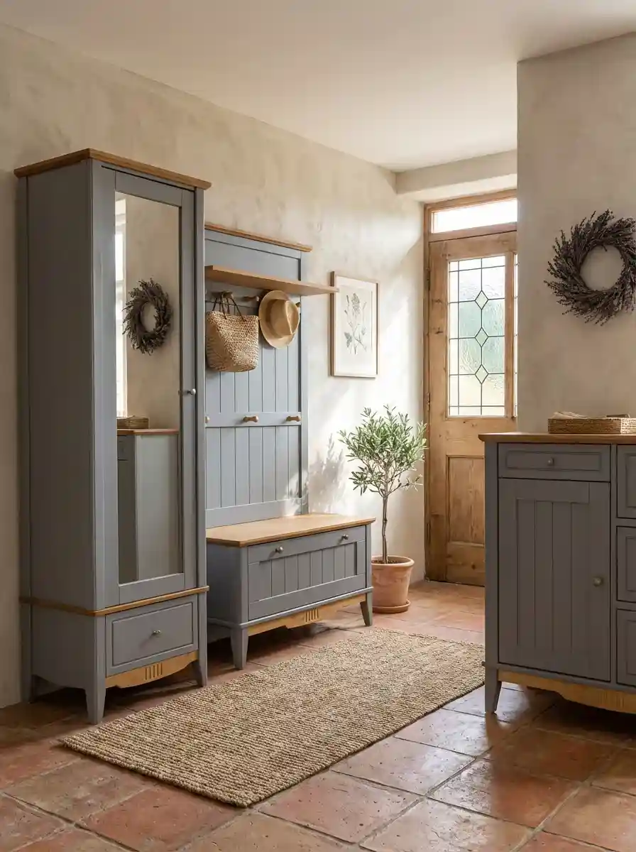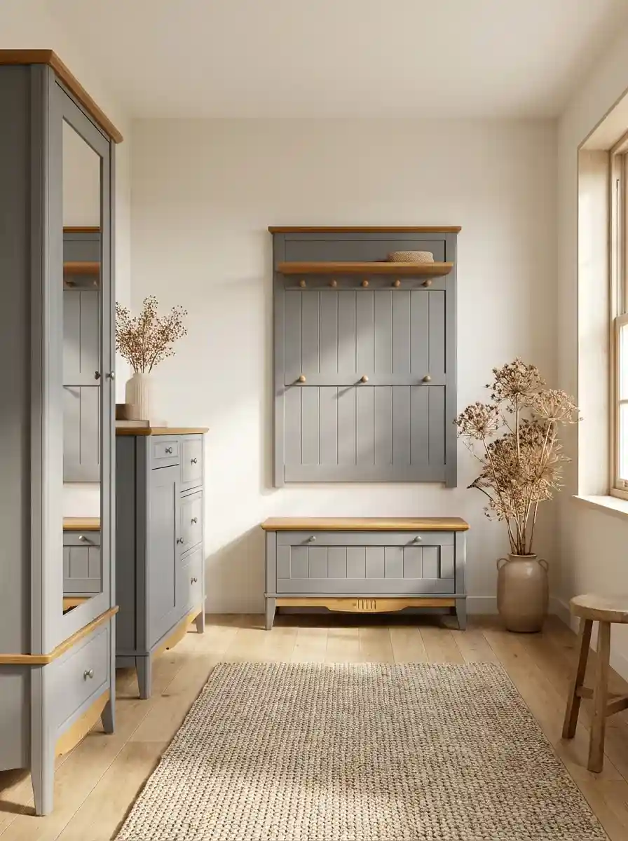 Корпус и фасад окрашены в серый цвет, крышка и нижняя декоративная планка в цвете «антик». Эта же модель обувной тумбы доступна в сочетаниях цветов «белый воск/антик» и «черный/антик». Для отделки применяются качественные, неаллергенные красители шведской марки Becker Acroma.