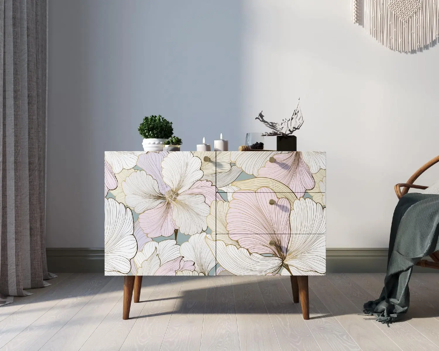 В компактном комоде три ящика и полка в левой секции за дверкой. Фасад украшает принт в спокойных тонах. Петли на дверях с доводчиком, ящики на шариковых направляющих. Для изготовления модели применены два вида материалов: ЛДСП для корпуса и массив ясеня для ножек.