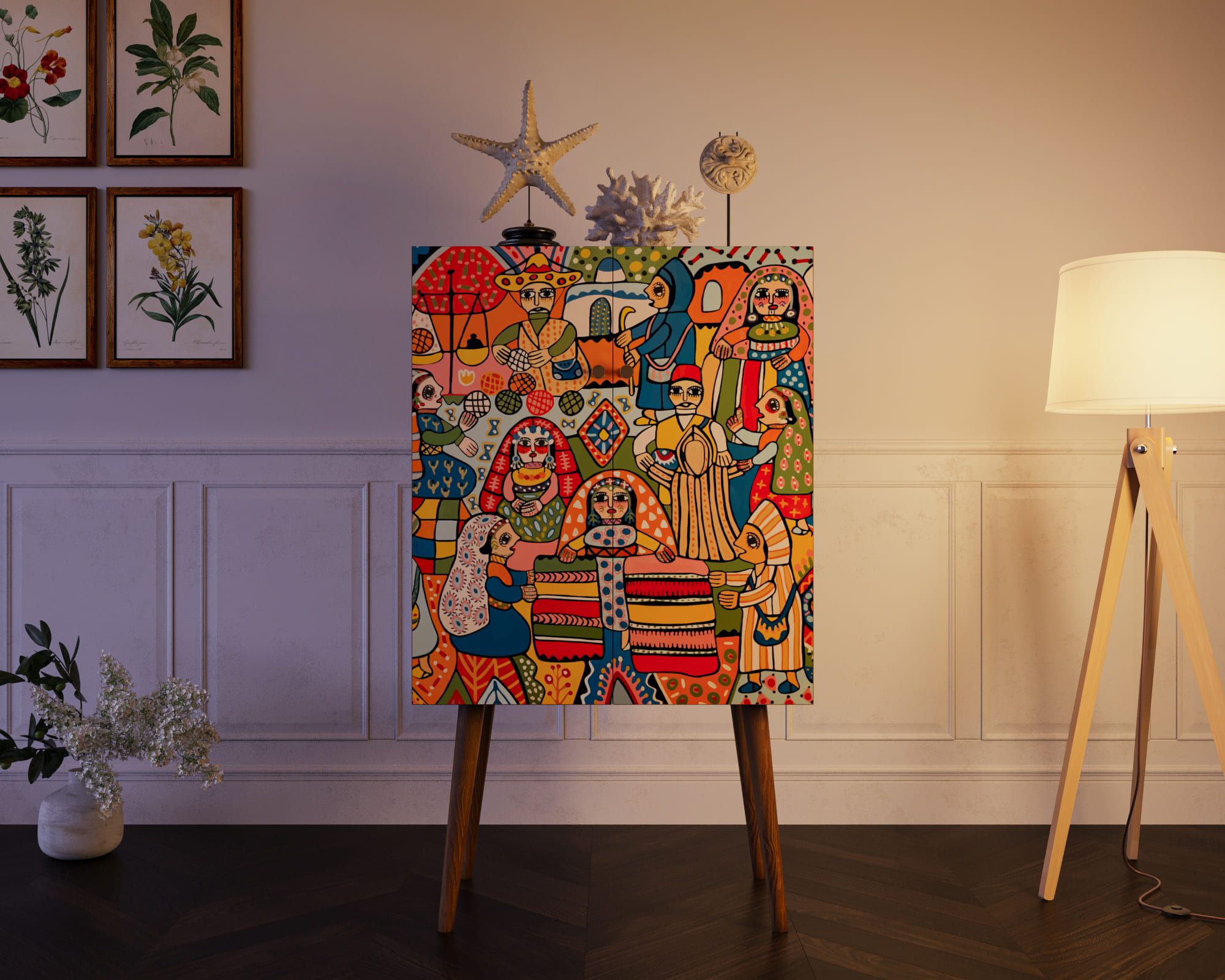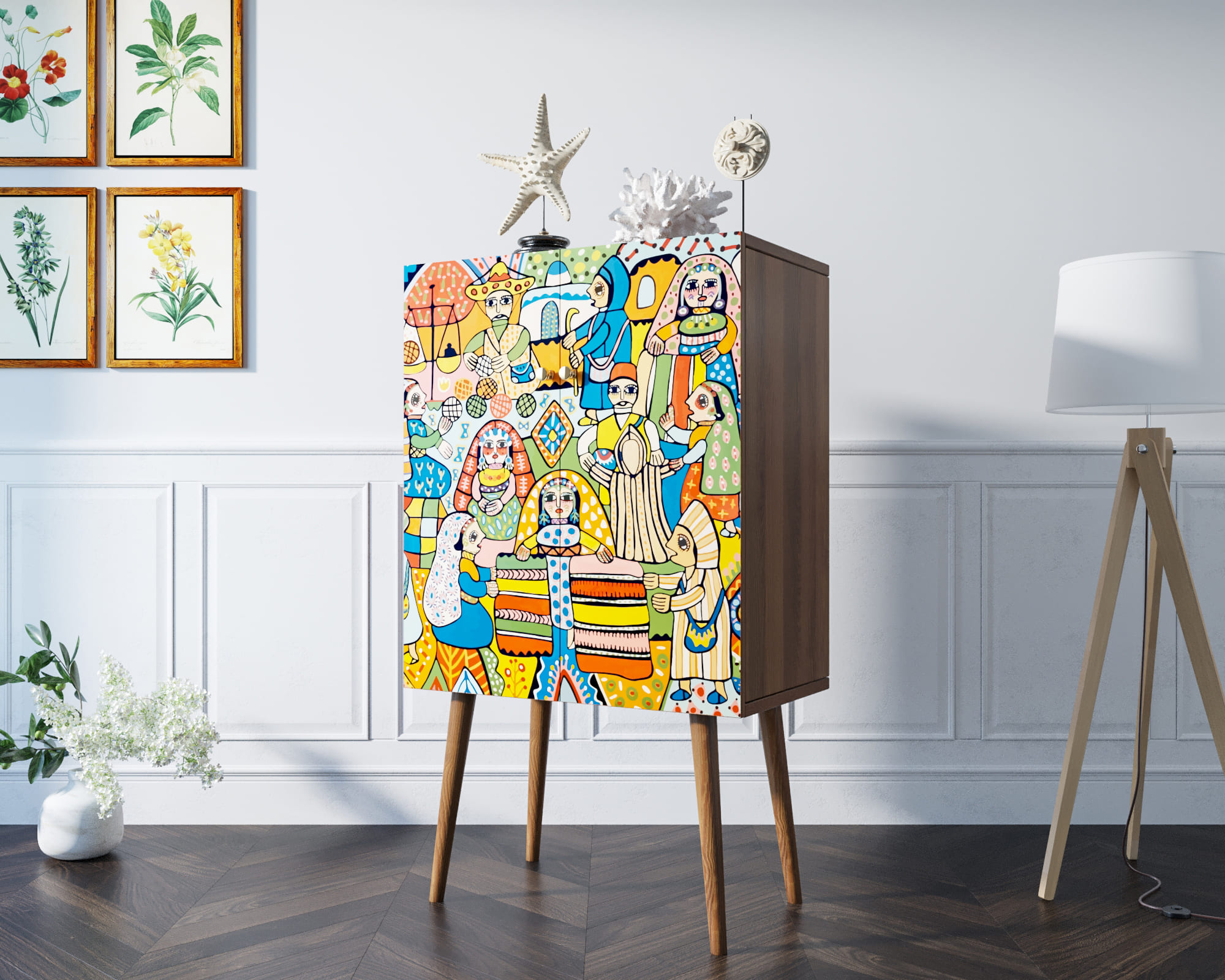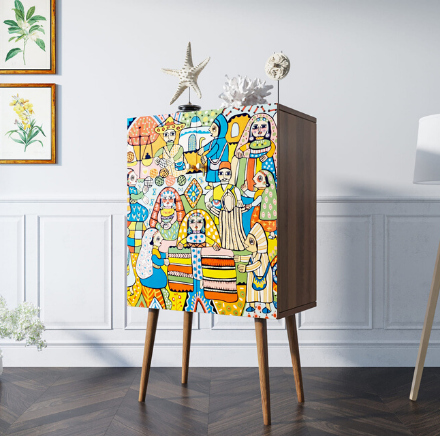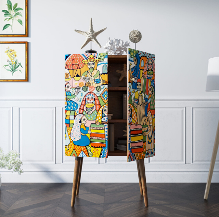 Корпус и ящики изготавливаются из ЛДСП австрийской компании "EGGER". Ножки мы делаем из массива ясеня и крепим на стальную пластину, на дверях петли с доводчиком а на ящиках шариковые направляющие. Принт на фасады наносится принтером специальными УФ - чернилами.