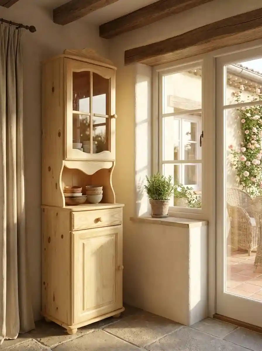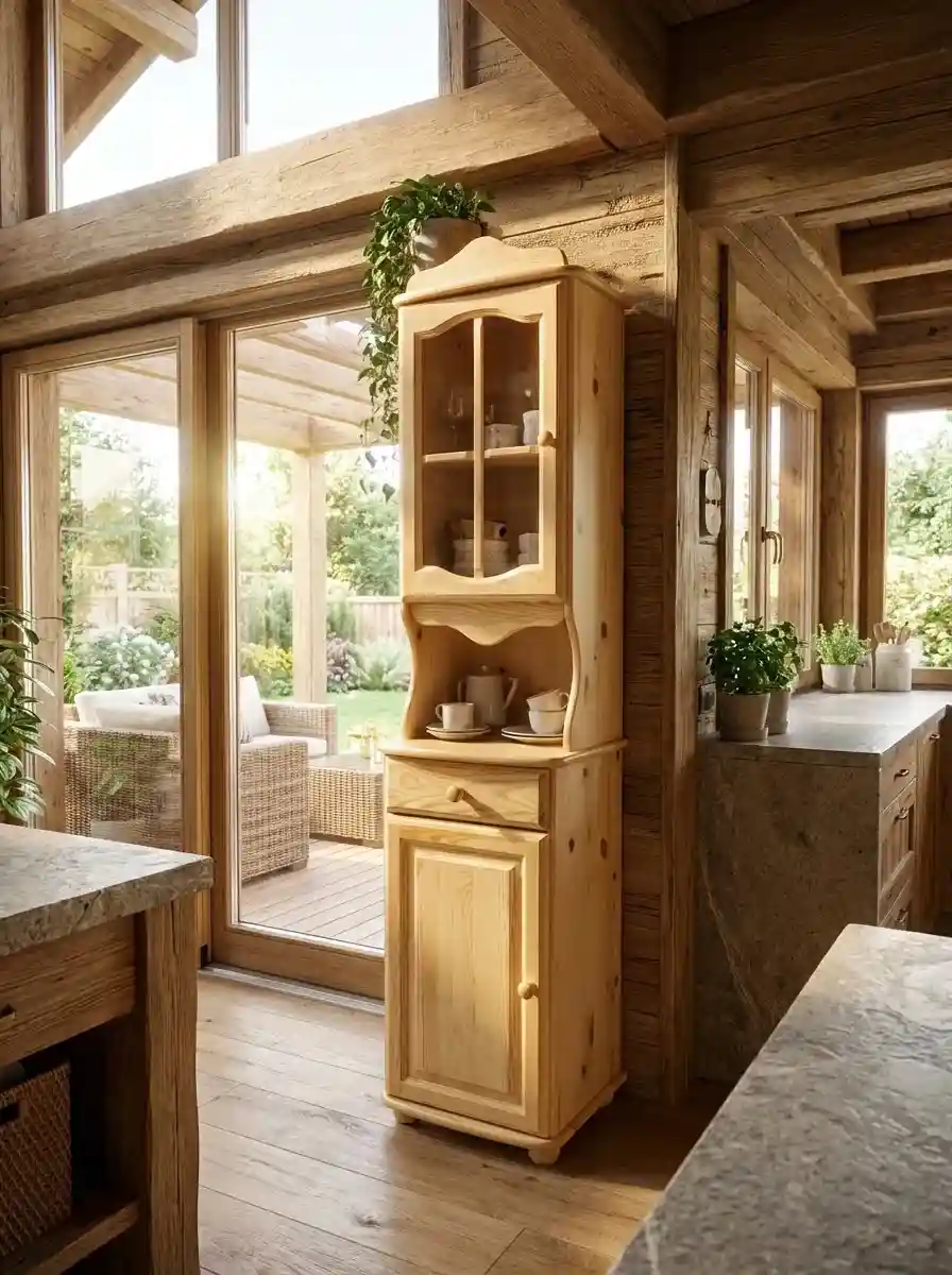 Все лицевые фасады, изготовлены из бессучкового массива путём ручной сортировки сырья. При изготовлении буфета, кроме натурального дерева, не применяется никакие другие материалы, наподобие дсп, мдф и разных, других материалов, которые могли бы поставить под сомнение прочность и надежность конструкции. Купить шкаф для посуды Норд 101 особо рекомендуется тем, кто располагает помещениями небольшой площади поскольку буфет имеет очень компактные габариты по ширине, глубине и высоте: 410х380х1930 мм. Обратите внимание на глубину этого буфета, всего 38 см. При этом он весьма вместителен, а через стеклянные дверцы верхнего шкафчика отлично будет видна ваша красивая посуда, на фоне задней стенки, выполненной из сосновой вагонки! Буфет стоит на круглых, крепких ножках так же из массива сосны. Высота от пола до дна тумбы буфета составляет 6 см. Это обеспечивает возможность помыть и протереть пол под буфетом.