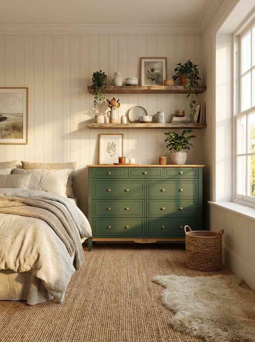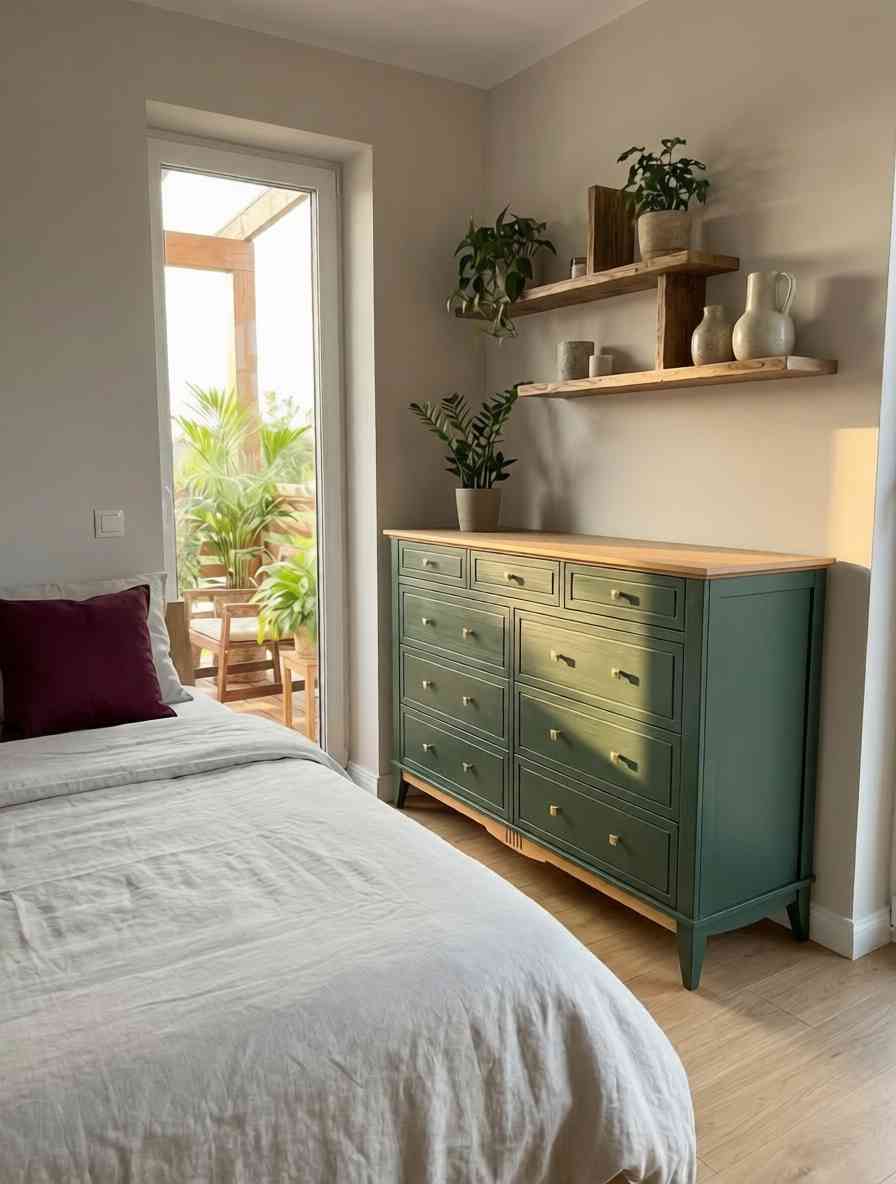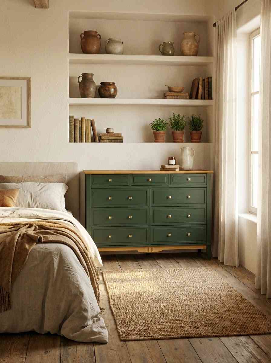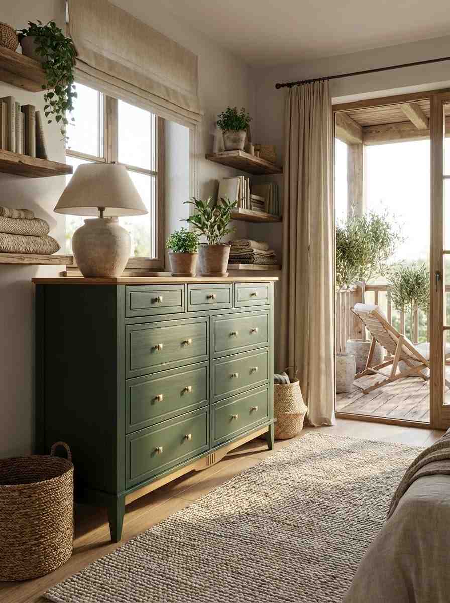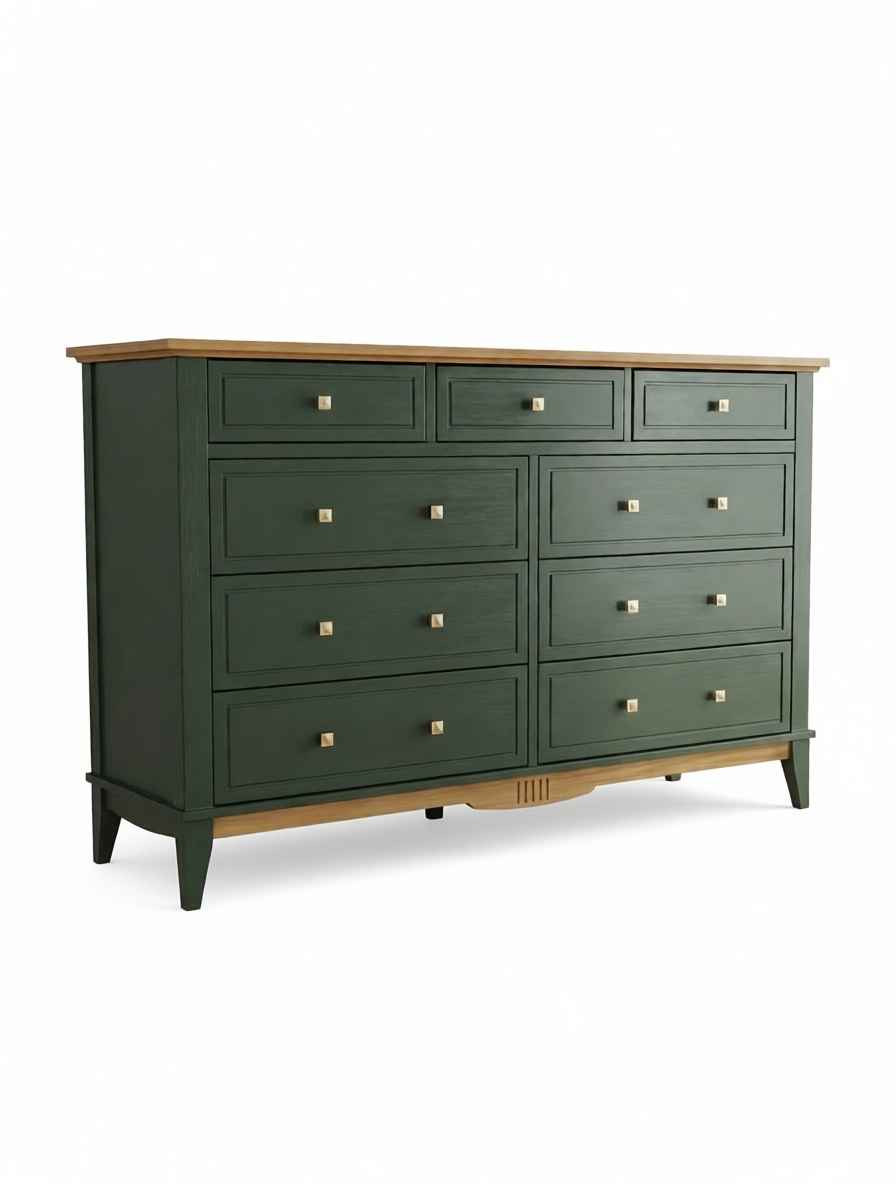 Оригинальное цветовое решение: Корпус комода выдержан в благородном зеленом тоне (RAL 6020), крышка и нижняя декоративная планка окрашены в тёплый цвет антик, через который просвечивает текстура дерева. Донья ящиков сделаны из оргалита светло – коричневого древесного цвета, стенки ящиков окрашены в цвет корпуса.