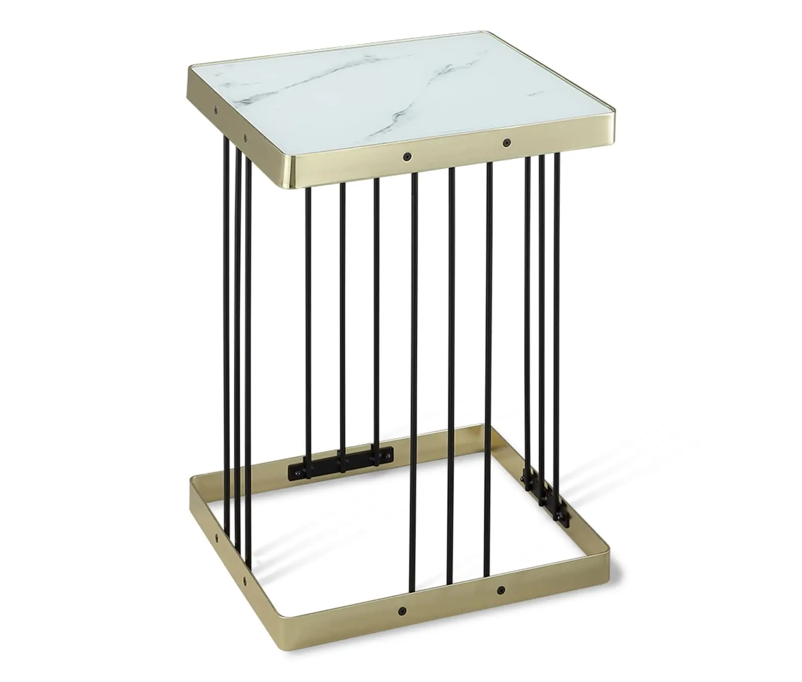металлический каркас окрашен золотой краской, устойчивой к механическому воздействию. Столешница выполнена из толстого закаленного стекла с рисунком.