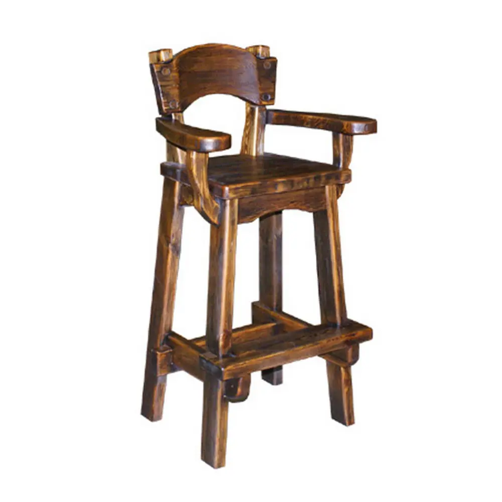 Модель интересна своим деревенским дизайном и компактностью. Каркас создан из массива сосны с брошированием и тонировкой. Конструкция состоит из сиденья со спинкой и подлокотниками и высоких ножек со специальной перекладиной для ног. Стул имеет массивные ножки, что будет гарантией устойчивости. Для удобного расположения можно использовать дополнительную накидку или мягкую подушку для стульев. Анатомическая спинка будет поддерживать вашу спину, что сводит на нет возникновение болевых ощущений в районе поясницы. Для ухода за ним достаточно проводить периодическую влажную уборку.